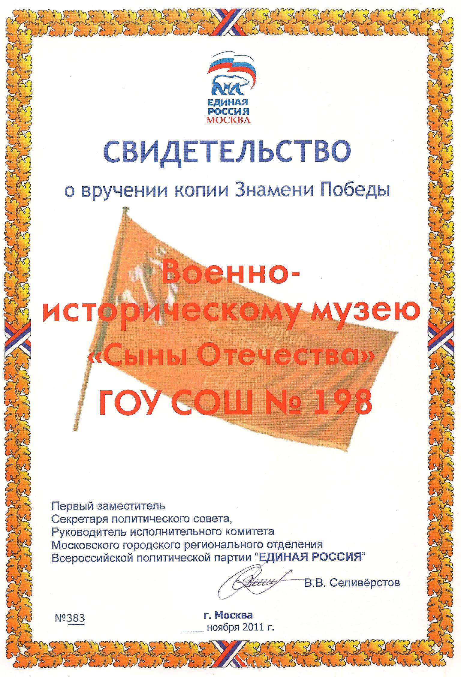 Свидетельство о вручении копии Знамени Победы